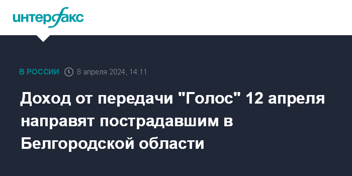 "Доход от голосования в "Голосе" 12 апреля Первый канал и другие присоединившиеся к акции партнёры перечислят в Российский Красный Крест. Средства пойдут на помощь пострадавшим от обстрелов жителям Белгородской и других приграничных областей", - говорится в сообщении пресс-службы канала в понедельник.