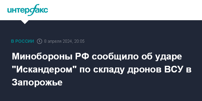 Москва. 8 апреля. INTERFAX.RU - Российские военные заявили об ударе ракетным комплексом "Искандер" по складу дронов армии Украины и по цеху их производства в Запорожье.