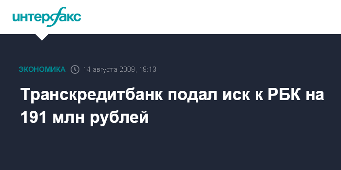 Москва. 14 августа. INTERFAX.RU - Транскредитбанк присоединился к другим кредиторам ОАО "РБК Информационные системы", требующим возврата долгов через суд. Арбитражный суд Москвы в пятницу зарегистрировал иск Транскредитбанка к РБК на сумму 191,7 млн рублей.