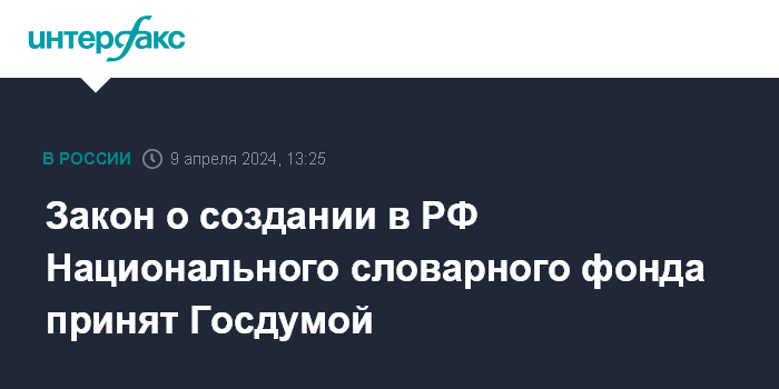 Москва. 9 апреля. INTERFAX.RU - Госдума во вторник приняла во втором и сразу в третьем, окончательном чтении закон о создании государственной информационной системы "Национальный словарный фонд".