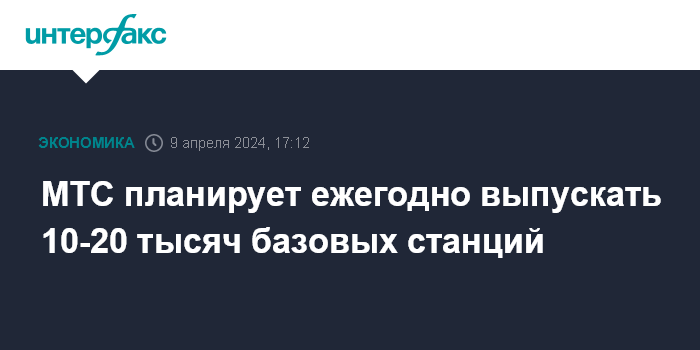 Москва. 9 апреля. INTERFAX.RU - ООО "Иртея" ("дочка" ПАО "МТС", специализирующаяся на производстве базовых станций) планирует с 2025 года выпускать по 10-20 тысяч базовых станций ежегодно, сообщил на форуме "Телеком 2024" президент МТС Вячеслав Николаев.