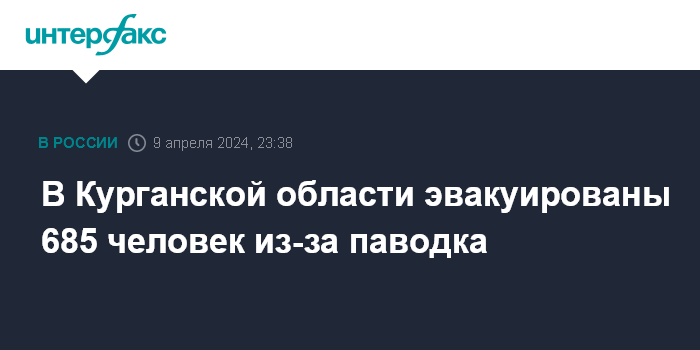 Москва. 9 апреля. INTERFAX.RU - Число эвакуированных из-за паводка жителей Курганской области составляет 685 человек, в регионе создано 92 пункта временного пребывания, сообщает областное правительство.