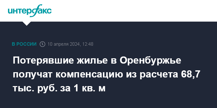 "В соответствии с правилами №1327 предусмотрено выделение средств из федерального бюджета на обеспечение жильем в случае его утраты в связи с чрезвычайной ситуацией. Стоимость компенсации 1 квадратного метра жилья для Оренбургской области составляет 68,712 тысяч рублей", - сказали в пресс-службе.