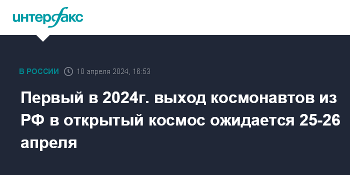 Первый в 2024г. выход космонавтов из РФ в открытый космос ожидается 25-26 апреля