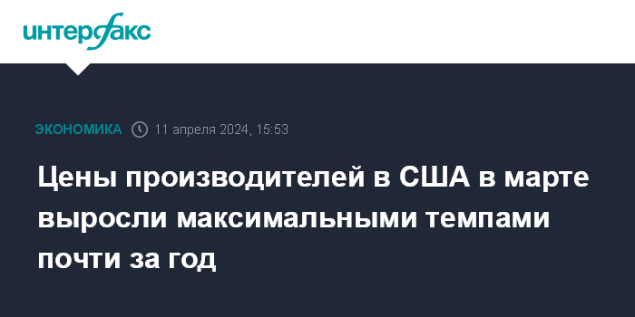 Москва. 11 апреля. INTERFAX.RU - Цены производителей в США (индекс PPI) в марте 2024 года выросли на 2,1% в годовом выражении - максимальными темпами с апреля 2023 года, сообщило Минтруда страны.