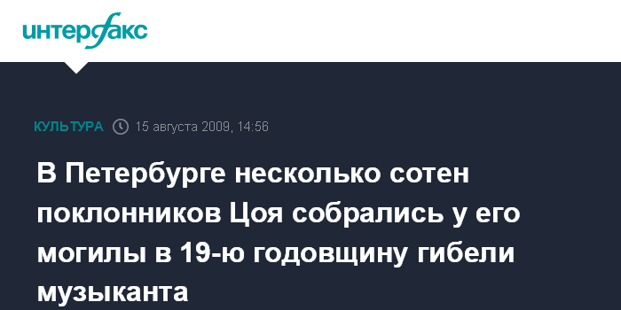 Москва. 15 августа. INTERFAX.RU - На Богословском кладбище Петербурга в субботу в 19-ю годовщину трагической гибели музыканта Виктора Цоя собралось около 200 поклонников его творчества.
