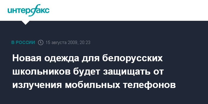 Минск. 15 августа. ИНТЕРФАКС-ЗАПАД - Впервые в Белоруссии для школьников стали выпускать одежду, защищающую от излучения мобильных телефонов, сообщила журналистам в Минске начальник управления организации потребительского рынка непродовольственных товаров министерства торговли Белоруссии Нина Пашко.