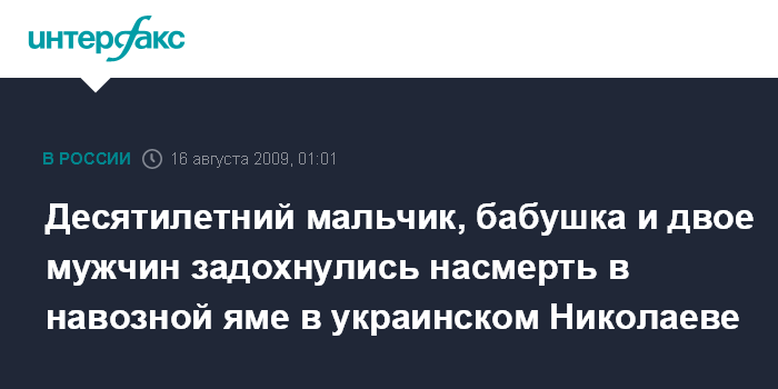 Киев. 16 августа. ИНТЕРФАКС-УКРАИНА - В городе Николаев в навозной яме погибли 10-летний мальчик и трое взрослых, которые пытались его спасти, сообщил агентству "Интерфакс-Украина" руководитель пресс-службы МЧС Украины Игорь Кроль.
