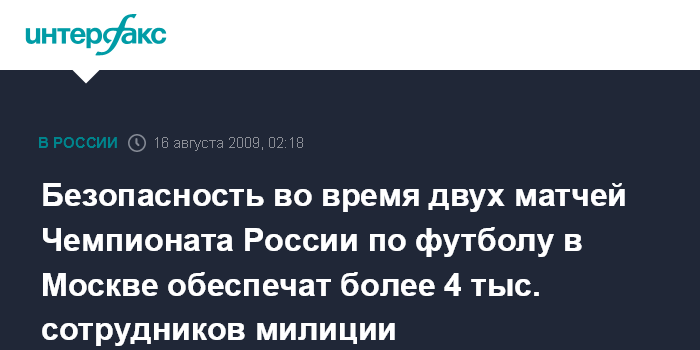 Москва. 16 августа. ИНТЕРФАКС-МОСКВА - В воскресенье в столице пройдут футбольные матчи Чемпионата России "Локомотив" - ЦСКА и "Москва" - "Спартак", охрану порядка на них будут обеспечивать более 4 тыс. сотрудников милиции, сообщили "Интерфаксу" в оперативном информационном управлении столичного ГУВД.