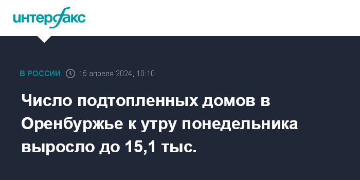 Москва. 15 апреля. INTERFAX.RU - Около 15,1 тыс. жилых домов и свыше 23,6 тыс. участков подтоплены в Оренбургской области к утру понедельника, сообщается в телеграм-канале регионального правительства.