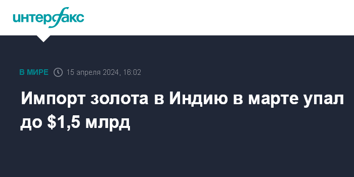 Москва. 15 апреля. INTERFAX.RU - Индия в марте 2024 года импортировала золота на $1,533 млрд. Об этом говорится в материалах министерства торговли и промышленности страны.