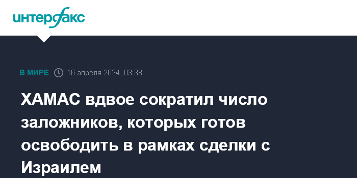 Москва. 16 апреля. INTERFAX.RU - Палестинское движение ХАМАС вдвое сократило число заложников, которые могут быть освобождены в ходе первого этапа соглашения с Израилем о прекращении огня, сообщает CNN ссылкой на осведомленный источник.