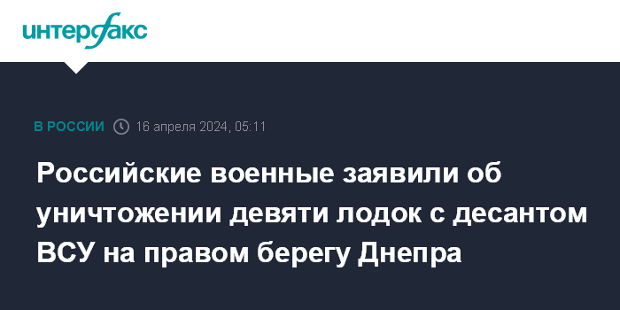 Москва. 16 апреля. INTERFAX.RU - В российской группировке войск "Днепр" сообщили об уничтожении девяти украинских лодок и нанесении ударов по местам посадки десанта ВСУ на правом берегу Днепра.
