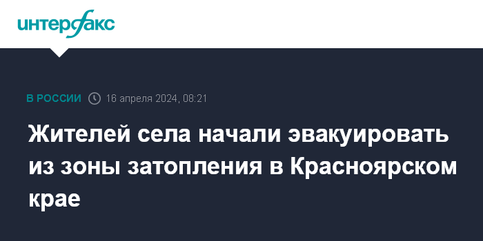 Москва. 16 апреля. INTERFAX.RU - Эвакуация сельских жителей из-за подъема уровня воды в реке Чулым началась в Большеулуйском районе Красноярского края, сообщает пресс-служба Главного управления МВД по региону во вторник.