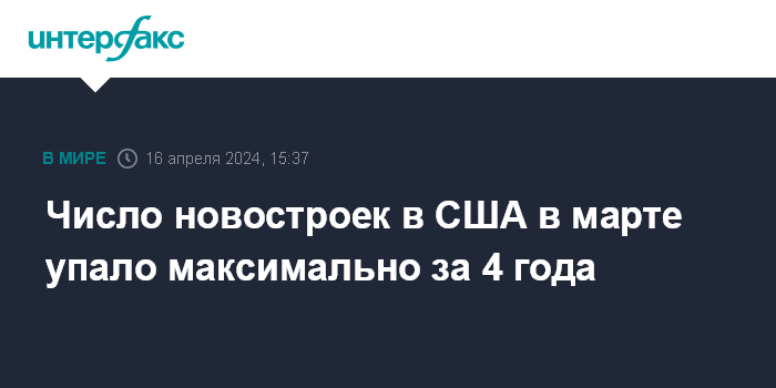 Москва. 16 апреля. INTERFAX.RU - Число домов, строительство которых было начато в США в марте, упало на 14,7% относительно предыдущего месяца и составило 1,321 млн в пересчете на годовые темпы. Об этом говорится в пресс-релизе министерства торговли страны.