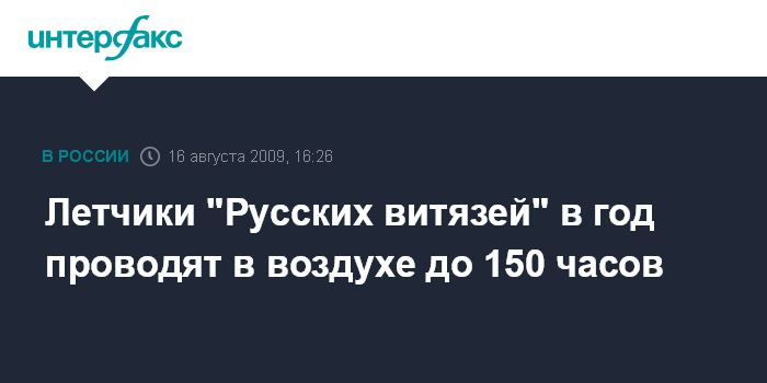 Москва. 16 августа. INTERFAX.RU - Среднегодовой налет летчиков пилотажной группы "Русские витязи", которые летают на самолетах Су-27, составляет 130-150 часов, сообщил командир пилотажной эскадрильи "Русские витязи", военный летчик первого класса Андрей Алексеев.