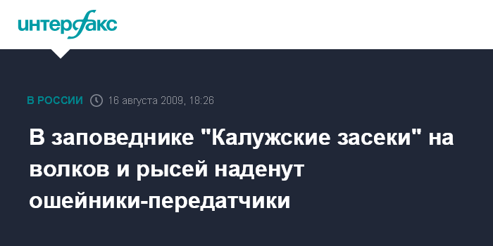 Калуга. 16 августа. INTERFAX.RU - В заповеднике "Калужские засеки" на четырех животных - волков и рысей - будут надеты GPS/ GSM- передатчики, сообщила "Интерфаксу" заместитель директора ГПЗ "Калужские засеки" по науке Ольга Червякова.