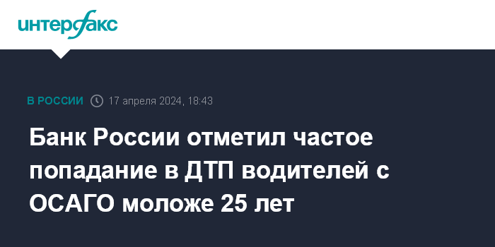 Москва. 17 апреля. INTERFAX.RU - Российские водители с полисами ОСАГО возрастом до 25 лет попадают в аварии в 2,1 раза чаще, чем в среднем по рынку, согласно опубликованным Банком России ключевым фактам об ОСАГО.