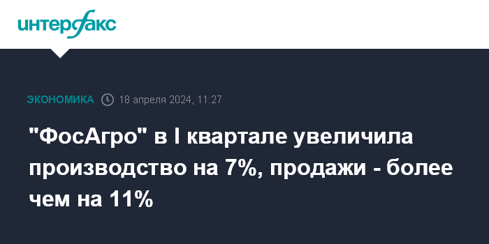 Москва. 18 апреля. INTERFAX.RU - Группа "ФосАгро" в I квартале увеличила производство агрохимической продукции на 7% к аналогичному периоду 2023 года, до 3 млн тонн, сообщила компания.