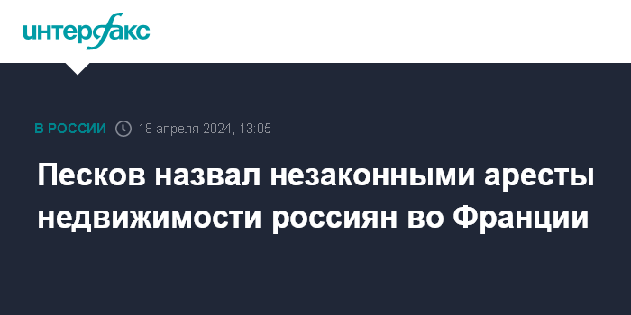 Москва. 18 апреля. INTERFAX.RU -Аресты собственности российских граждан во Франции, являются незаконными и подрывают основы правовой системы этой страны, заявил пресс-секретарь президента Дмитрий Песков.