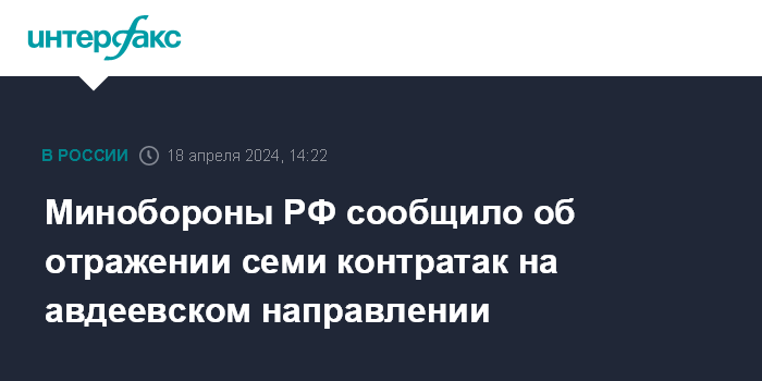 Москва. 18 апреля. INTERFAX.RU - Российские военные за сутки улучшили тактическое положение и отразили семь украинских контратак на авдеевском направлении, заявили в Минобороны РФ в четверг.
