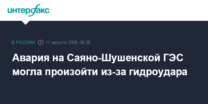 Москва. 17 августа. INTERFAX.RU - Основная версия аварии на Саяно-Шушенской ГЭС - гидроудар, произошедший в двух водоводах станции, сообщил журналистам начальник пресс-службы Сибирского регионального центра МЧС Дмитрий Кудрявцев.