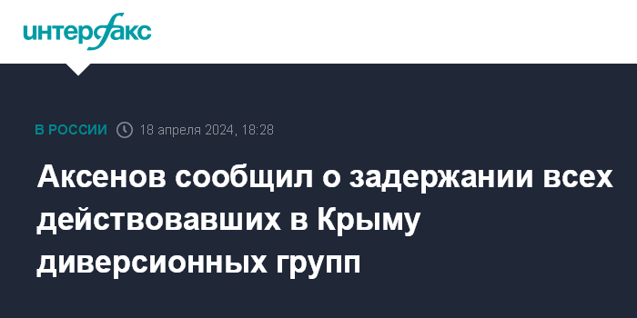 Москва. 18 апреля. INTERFAX.RU - Все диверсионные группы, совершившие подрывы в Крыму с 2014 года, установлены и задержаны, сообщил глава республики Сергей Аксенов в четверг на встрече с президентом России Владимиром Путиным по видеосвязи.