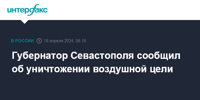 Москва. 19 апреля. INTERFAX.RU - Губернатор Севастополя Михаил Развожаев сообщил, что в пятницу утром средства ПВО сбили цель над акваторией Черного моря.