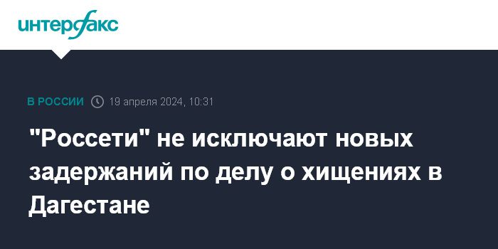 Москва. 19 апреля. INTERFAX.RU - ПАО "Россети Северный Кавказ" в ближайшее время допускает новые задержания сотрудников филиала компании - "Дагэнерго", подозреваемых в причастности к хищениям электроэнергии в Дагестане.