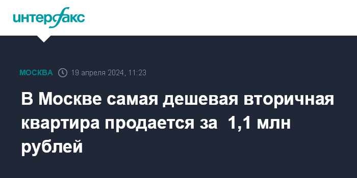 Москва. 19 апреля. INTERFAX.RU - Самая дешевая квартира на вторичном рынке Москвы обойдется в 1,1 млн рублей, говорится в исследовании аналитиков "Домклик" Сбербанка.