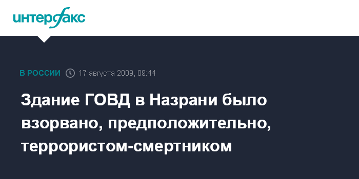 Москва. 17 августа. INTERFAX.RU - Здание ГОВД города Назрани взорвал террорист-смертник, который протаранил ворота здания на "Газели", сообщил агентству "Интерфакс-Юг" источник в МВД Ингушетии.