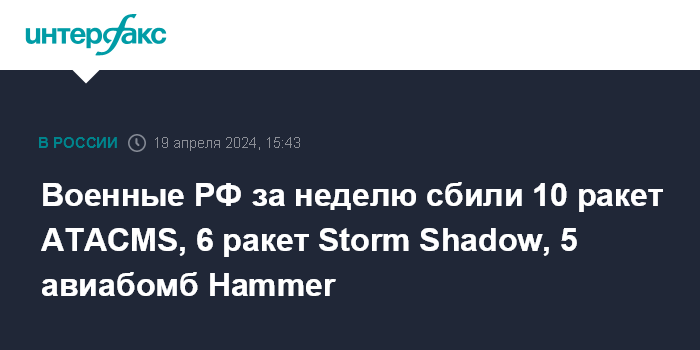 Москва. 19 апреля. INTERFAX.RU - Военнослужащие российской армии за неделю сбили 10 ракет ATACMS, шесть крылатых ракет Storm Shadow, пять авиабомб Hammer и JDAM и 1 тыс. 278 беспилотников ВСУ, сообщило министерство обороны РФ в пятницу.