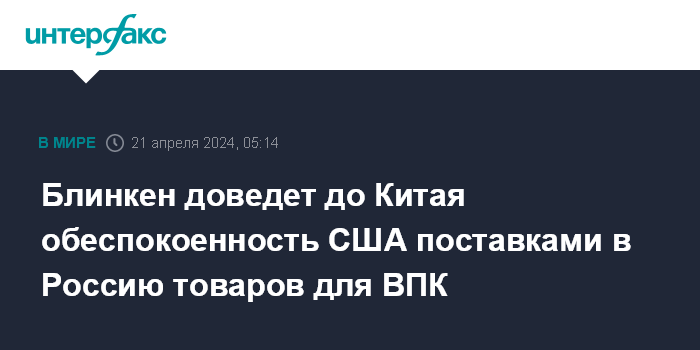 Москва. 21 апреля. INTERFAX.RU - Одним из вопросов, которые госсекретарь США Энтони Блинкен поднимет в ходе визита в Китай на следующей неделе, будет озабоченность Вашингтона поддержкой китайскими компаниями военно-промышленного комплекса России, сообщило агентство Bloomberg.