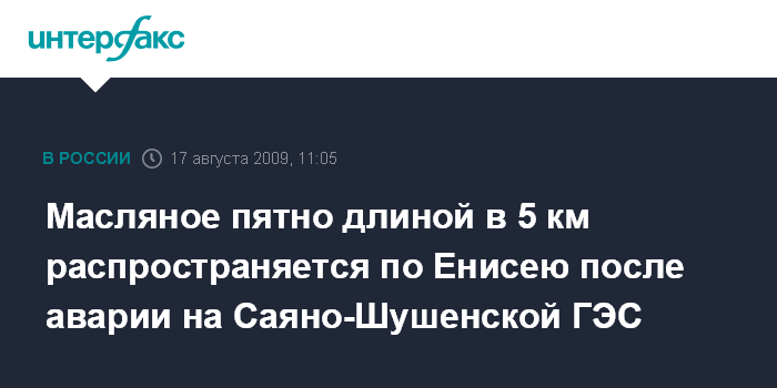 Москва. 17 августа. INTERFAX.RU - Крупное масляное пятно распространяется по Енисею в районе нижнего бьефа Саяно-Шушенской ГЭС, где в понедельник утром произошла авария.