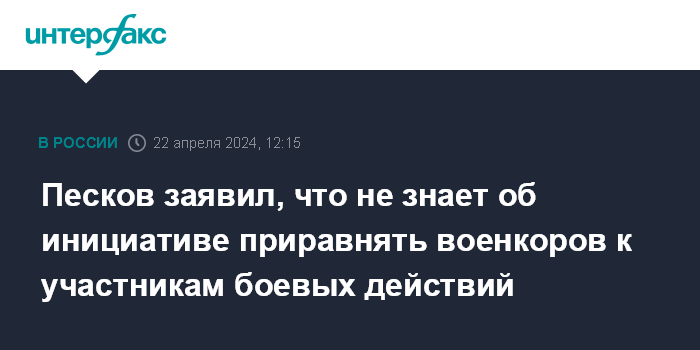 Москва. 22 апреля. INTERFAX.RU - Пресс-секретарь президента РФ Дмитрий Песков заявил, что ему не известно об официальных инициативах относительно того, чтобы приравнять военных корреспондентов, работающих в зоне специальной военной операции, к участникам боевых действий.