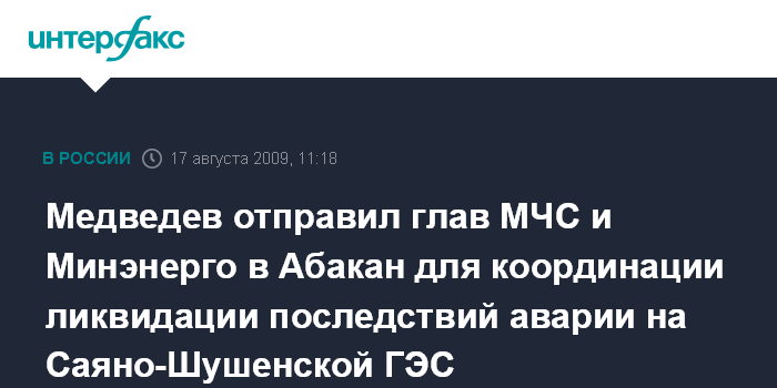 Москва. 17 августа. INTERFAX.RU - Президент РФ Дмитрий Медведев дал указание главе МЧС Сергею Шойгу и главе Минэнерго Сергею Шматко вылететь в Абакан с целью координации работ по ликвидации последствий аварии на Саяно-Шушенской ГЭС, организации бесперебойного снабжения электроэнергией населения и предприятий региона, восстановления мощностей ГЭС, сообщили в пресс-службе президента РФ.