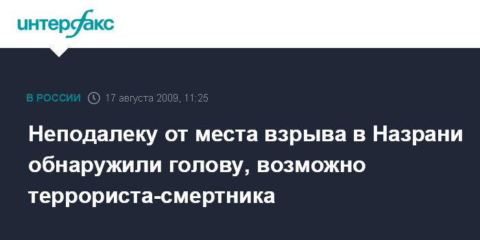 Москва. 17 августа. INTERFAX.RU - Примерно в 50 метрах от места взрыва возле здания ГОВД в Назрани обнаружена человеческая голова, которая могла принадлежать террористу-смертнику, сообщил агентству "Интерфакс-Юг" источник в следственных органах региона.