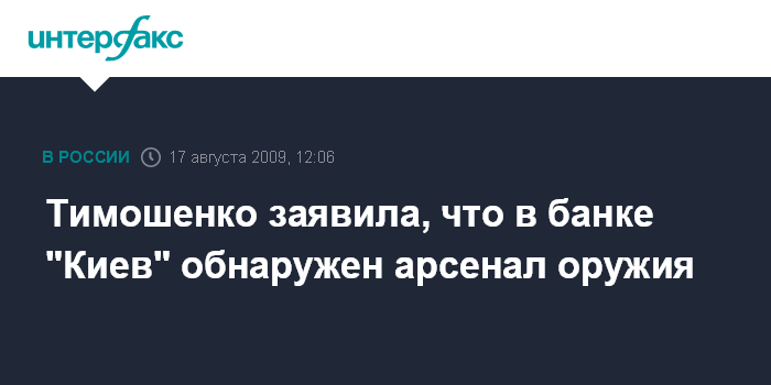Москва. 17 августа. INTERFAX.RU - Премьер-министр Украины Юлия Тимошенко заявила, что в банке "Киев" обнаружен "целый арсенал оружия", а также зафиксирован массовый вывоз и уничтожение финансовой документации.