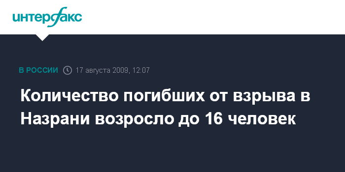 Москва. 17 августа. INTERFAX.RU - В результате взрыва у здания ГОВД Назрани число погибших составило 16 человек, еще около 60 числятся пострадавшими, сообщил агентству "Интерфакс-Юг" официальный представитель СКП РФ по Ингушетии.