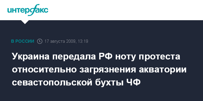 Москва. 17 августа. INTERFAX.RU - Министерство иностранных дел Украины передало ноту протеста МИД России в связи с загрязнением Севастопольской бухты Черноморским флотом РФ. Как сообщил исполняющий обязанности первого заместителя иностранных дел Украины Юрий Костенко во время пресс-клуба в МИД Украины в понедельник в Киеве, в целом, МИД Украины с января по август текущего года передало российской стороне 14 нот в связи с нарушениями Черноморским флотом РФ норм двухстороннего соглашения и законодательства Украины.