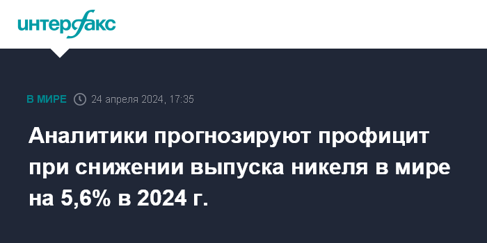 Москва. 24 апреля. INTERFAX.RU - Производство первичного никеля в мире в 2024 году снизится на 5,6% и составит 3,356 млн тонн, прогнозирует Международная исследовательская группа по никелю (INSG).