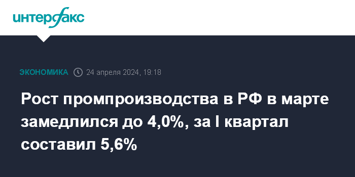 За I квартал 2024 года промпроизводство в РФ выросло на 5,6% по сравнению с аналогичным периодом прошлого года.