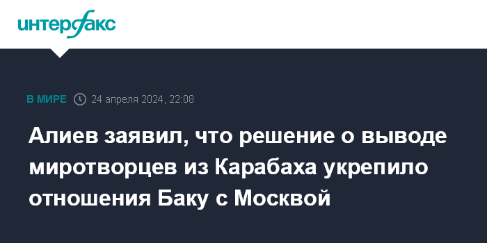 Москва. 24 апреля. INTERFAX.RU - Президент Азербайджана Ильхам Алиев заявил, что решение о досрочном выводе российских миротворцев из Карабахского региона страны было принято на основе консультаций между Баку и Москвой и в итоге укрепило отношения между Азербайджаном и Россией.
