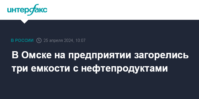 Москва. 25 апреля. INTERFAX.RU - В Омске на предприятии на Красноярском тракте загорелись три емкости с нефтепродуктами объемом по 50 кубометров каждая, сообщил телеграм-канал МЧС.