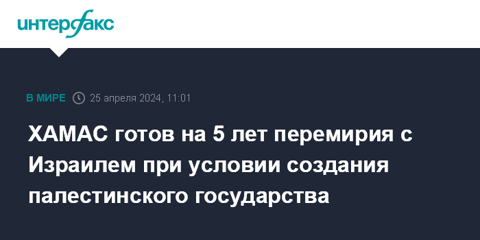 Москва. 25 апреля. INTERFAX.RU - Группировка ХАМАС готова на перемирие с Израилем на пять лет или больше, если будет имплементировано решение о создании двух государств, заявил член политбюро группировки Халиль аль-Хайя в интервью Associated Press, опубликованном в четверг.