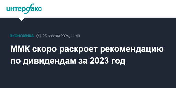 Москва. 25 апреля. INTERFAX.RU - ПАО "Магнитогорский металлургический комбинат" в ближайшее время раскроет рекомендацию совета директоров по размеру дивидендов за 2023 год, сообщил "Интерфаксу" председатель совета Виктор Рашников.