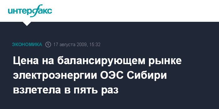 Москва. 17 августа. INTERFAX.RU - Балансирующий рынок электроэнергии (БР) объединенной энергосистемы Сибири отреагировал на аварию на Саяно-Шушенской ГЭС резким ростом цен - индекс БР в понедельник взлетел в 5 раз, пробив цену в 1 тыс. руб./МВт.ч, следует из материалов на сайте ОАО "Системный оператор" (СО).