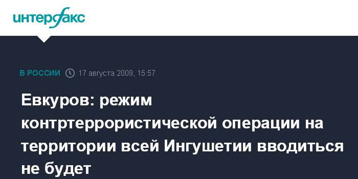 Москва. 17 августа. INTERFAX.RU - В Ингушетии нет оснований вводить режим контртеррористической операции (КТО) на территории всей республики, считает президент Ингушетии Юнус-Бек Евкуров.