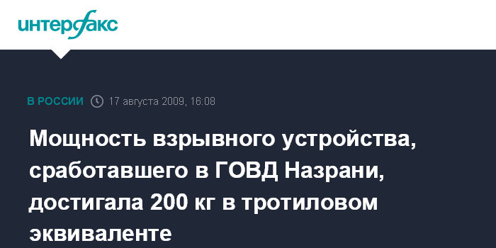 Москва. 17 августа. INTERFAX.RU - Мощность взрывного устройства, сработавшего в горотделе Назрани, составляла, по предварительным данным, порядка 200 кг в тротиловом эквиваленте, сообщил "Интерфаксу" в понедельник официальный представитель СКП РФ Владимир Маркин.