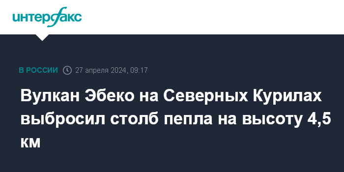 Москва. 27 апреля. INTERFAX.RU - Вулкан Эбеко, расположенный на северокурильском острове Парамушир, днем в субботу выбросил столб пепла на высоту 4,5 км над уровнем моря, сообщает пресс-служба ГУ МЧС по Сахалинской области.